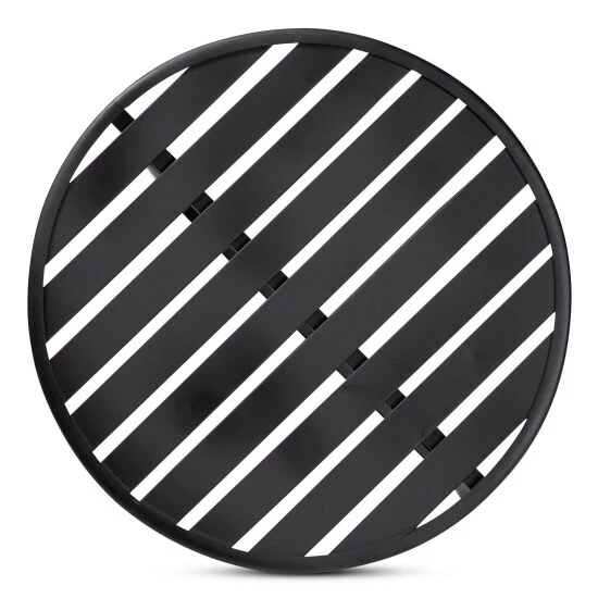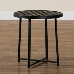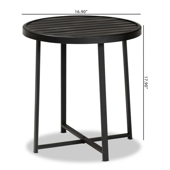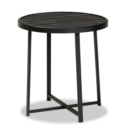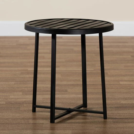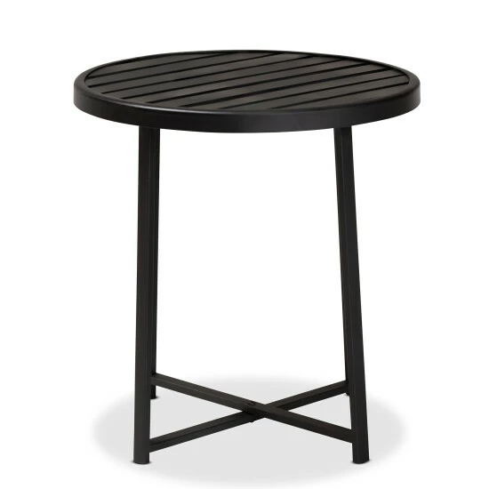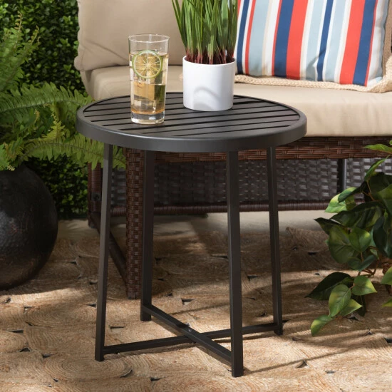 Fill out your backyard lounge with the simple yet versatile design of the Sadiya outdoor side table. Made in China, this table is made from solid metal. Its round tabletop provides space for outdoor snacks and drinks, while the slatted design allows light to flow naturally throughout the area. The Sadiya requires assembly and features a crisscross base for excellent stability and support with geometric charm. Perfect for accommodating snacks and drinks, the Sadiya outdoor side table enhances the layout of any patio or deck.