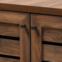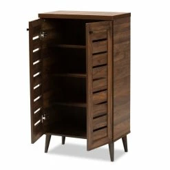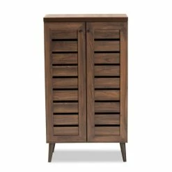 Tidy up your entryway with the fantastic convenience and style of the Salma shoe cabinet. Made in Malaysia, this cabinet is comprised of a sturdy wood frame. Four shelves located behind the doors offer storage for around eight pairs of shoes, depending on size. Requiring assembly, the Salma utilizes slatted wood doors that enable air circulation and disperse odors. Angled legs create a mid-century profile, making the Salma shoe cabinet an outstanding addition to any home…