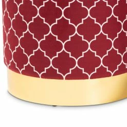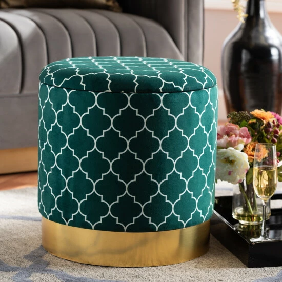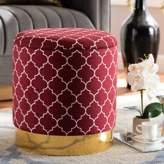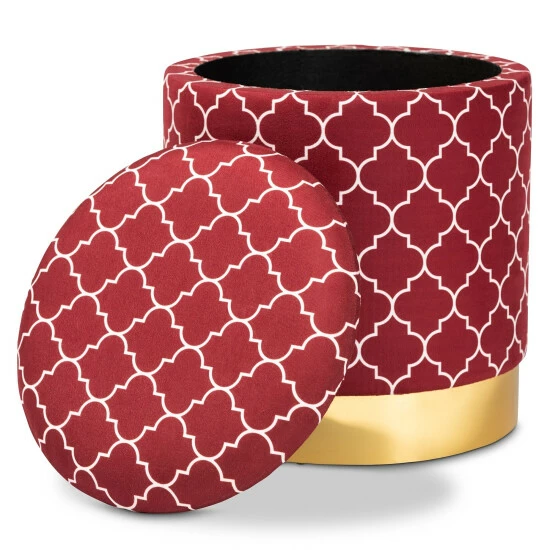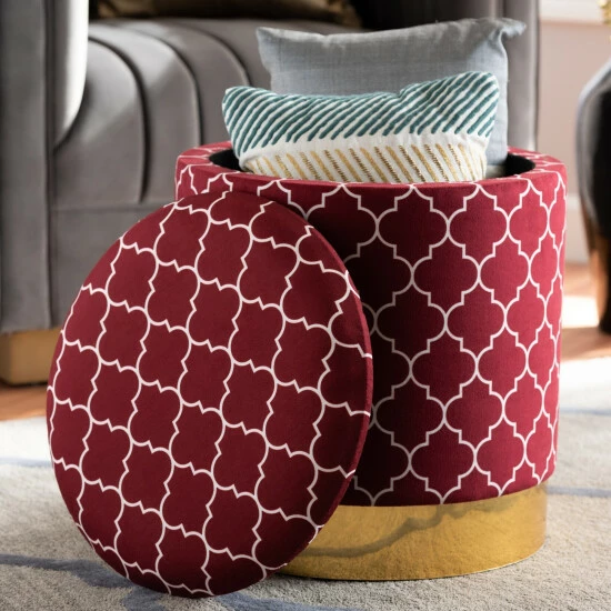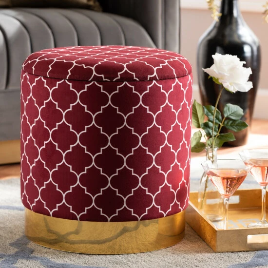Keep extra pillows out of sight in this Serra ottoman, which features a lift-off lid and a hidden compartment for clutter-free storage. The padded top makes a comfortable seat or footrest, and the quatrefoil-print velvet upholstery adds an extra touch of softness. A gold metal base adds a glam finishing touch.