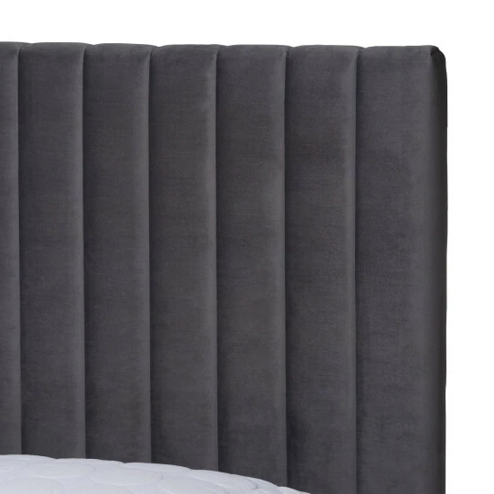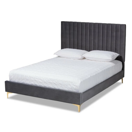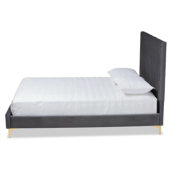 Establish a luxurious retreat in your bedroom to rest and relax with the lavish style of the Serrano platform bed. Made in Malaysia, this magnificent piece consists of a solid wood frame padded with foam and upholstered in sumptuous velvet fabric. The tall headboard features a sleek channel tufted design for a geometric display that provides superb back support when sitting in bed. The Serrano requires assembly and utilizes wood slats for mattress support, removing the need for a box spring. Polished metal legs complete the look, making the Serrano platform a remarkable upgrade to the modern bedroom.