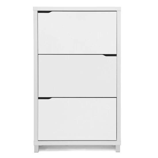 Ensure your shoe collection stays neat and organized with this Baxton Studio Simms shoe cabinet. The elegant white finish elevates the clean lines and gently curved door pulls accent the contemporary charm of your decor. With three fold-out doors, this cabinet conveniently conceals your shoes. The three-tier design features two shelves in each drawer for ample storage.