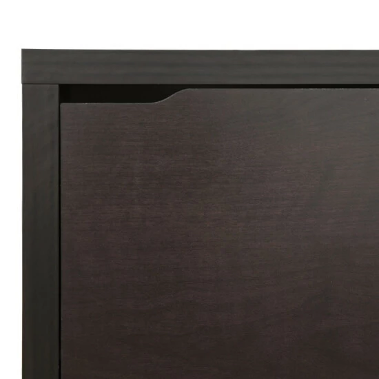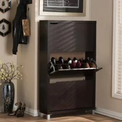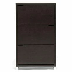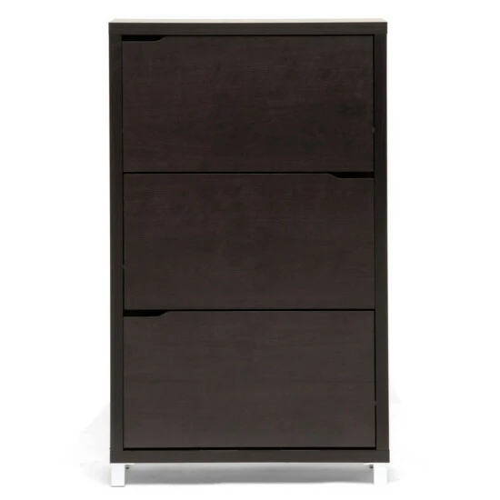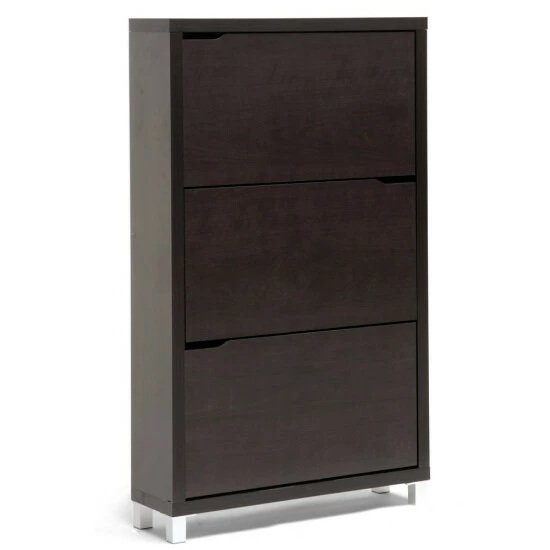 Straighten out a cluttered footwear collection with this Baxton Studio Simms shoe cabinet. Each drop-down drawer houses two shelves, which retract into the durable engineered wood frame to keep shoes concealed yet easily accessible. Clean lines, silver legs, and a veneer finish give this cabinet a simple sophistication that coordinates with modern decor.