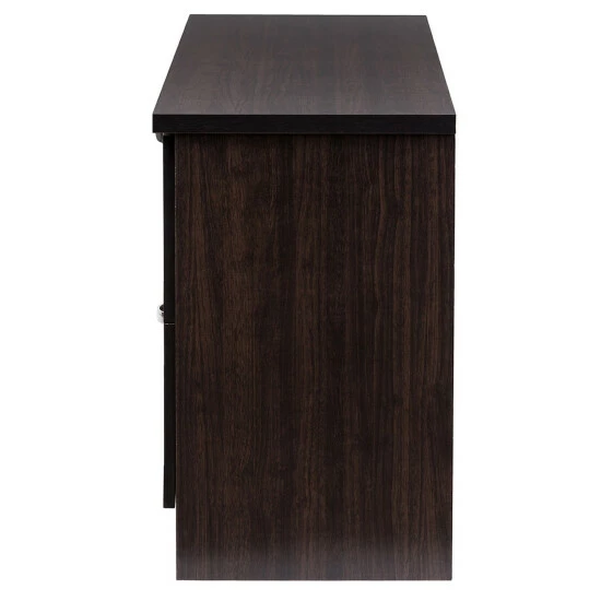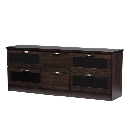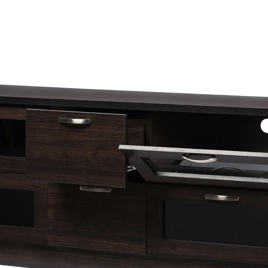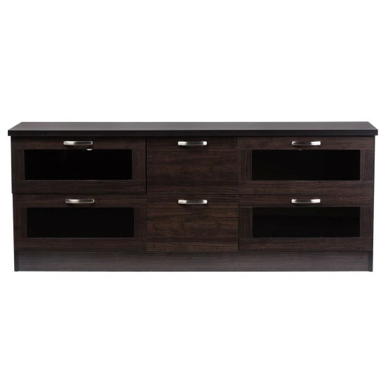 Create a centerpiece with your television on this wood TV cabinet. Featuring two drawers and four cabinets with glass doors, this TV cabinet has plenty of storage space for movies, music, video games and consoles. This brown wood cabinet wipes clean with a cloth for easy care.