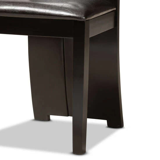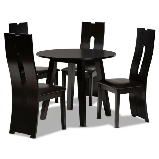 A unique blend of modern comfort and minimalist design, the Torin dining set adds character to any space. Made in Malaysia, the Torin is constructed from sturdy wood and includes four chairs and one table. Plush foam-padded seats covered by smooth faux leather provide a comfortable embrace while the circular tabletop allows for ample elbow room for each member of the table. Requiring assembly, the darker tones of the Torin allow the set to easily blend in with modern home layouts. A cozy choice equipped with lavish comfort, the Torin dining set is an excellent addition to any home…