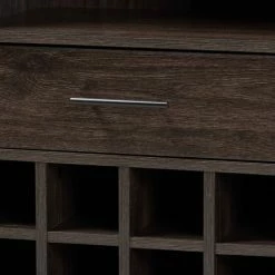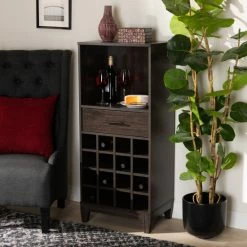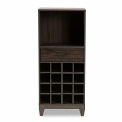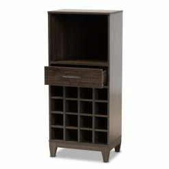 Featuring a sleek finish and fantastic storage capability, the Trenton wine cabinet adds valuable utility to any space. Made in Malaysia, this wooden cabinet features a dark brown finish that complements any color palette. Sixteen individual wine cubbies provide space to store wine bottles. One drawer and one shelf provide additional storage space. Requiring assembly, the Trenton is fitted with a black drawer handle and tapered legs for a contemporary touch. A stunning piece that enhances any kitchen or dining area, the Trenton wine cabinet is a fantastic addition to the modern home..