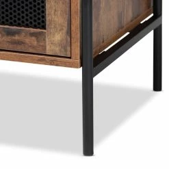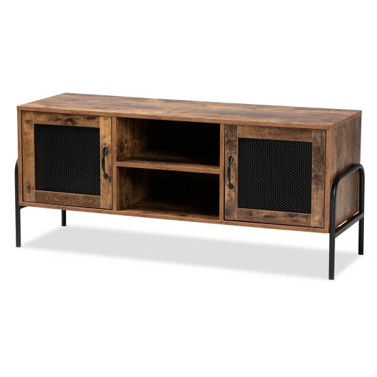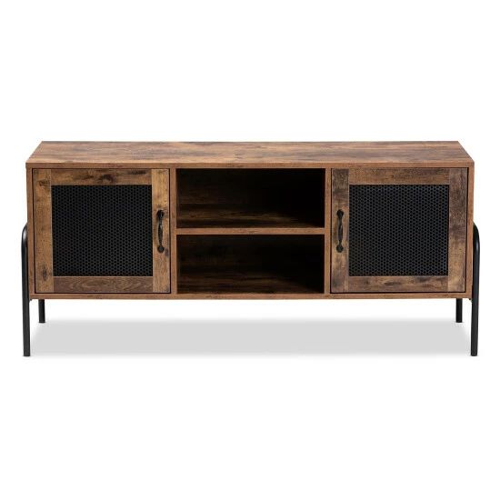 Warm tones and robust charm radiate from the Valeska TV stand to act as a prominent focal point in your living room. Made in China, this versatile piece is comprised of a solid metal frame fitted with sturdy wood. Two open shelves offer room for media devices, while two additional shelves behind the mesh metal doors provide secure storage space. Requiring assembly, the Valeska is adorned with curved metal drawer handles that highlight the modern industrial nature of the piece. Serving as a streamlined yet hearty accessory, the Valeska TV stand develops any living room setting. . . .