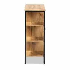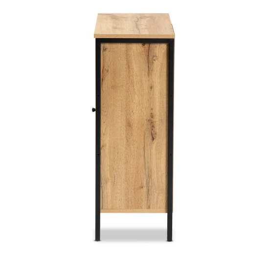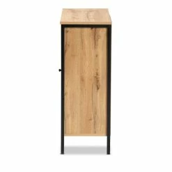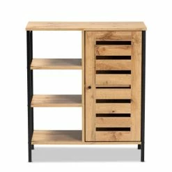 With a compact and stylish design, the Vander shoe cabinet is a convenient upgrade for busy entryways. Made in Malaysia, the Vander features an oak brown finished wood frame supported by sleek black finished metal legs. Three open shelves and two additional shelves behind the door provide space for around five pairs of shoes, depending on size. Requiring assembly, the Vander features a slatted wood door that enables air circulation and prevents odor buildup. An easy solution to entryway storage, the Vander shoe cabinet accommodates the modern home in superb style…