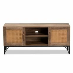 Grace your living room with the charming, Bohemian aesthetics of the Veanna TV stand. Made in China, this stunning piece combines synthetic rattan accents with a sturdy wood and metal frame for a tranquil, carefree display that exudes warmth. Two open shelves create a convenient display for media devices, while two additional shelves behind the doors offer secure storage space. Requiring assembly, the Veanna features a cord management hole on its back panel for quick and easy setup. An outstanding focal point with ample storage potential, the Veanna TV stand is a stylish solution to media organization…