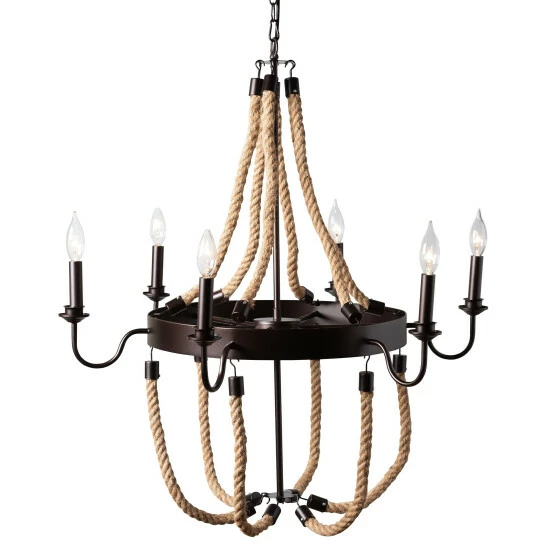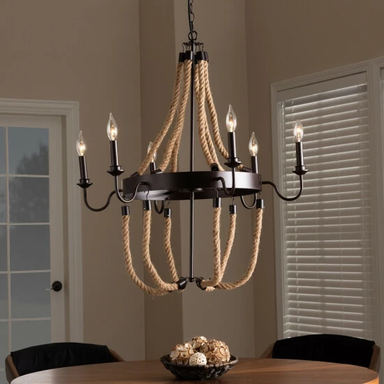 Featuring a rich mix of materials, the Cassia chandelier is a striking addition to any space. Twelve pieces of hemp rope are suspended from a circular metal ring that holds six light bulbs. Candle base sockets with curved arms and matte espresso-finished metal give this chandelier an antique feel.