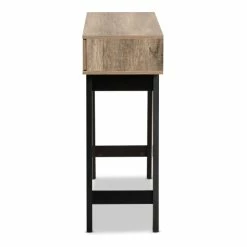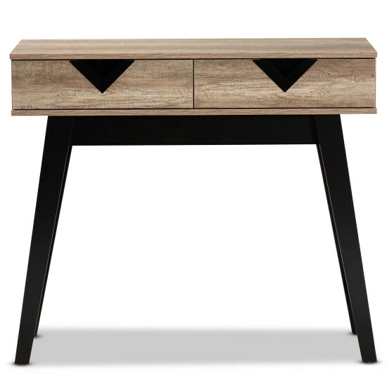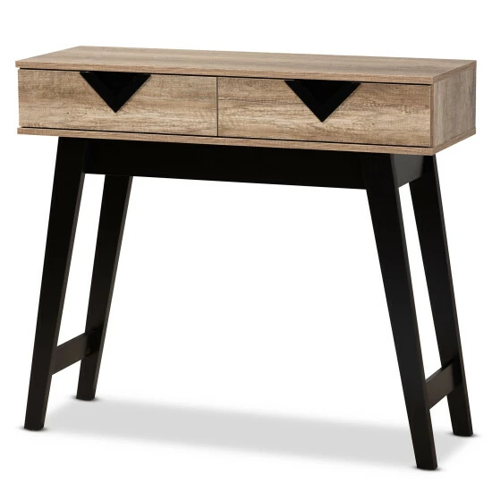 The Wales console table combines function with modern style. Made in Malaysia, this table is constructed from sturdy wood and showcases a sleek geometric design. Two drawers provide secure storage for household essentials while the wide tabletop creates a stunning display for decorative items. Requiring assembly, the Wales is supported by long, angled legs that form an expressive silhouette. Built to last, the Wales console table enhances the layout of any space…
