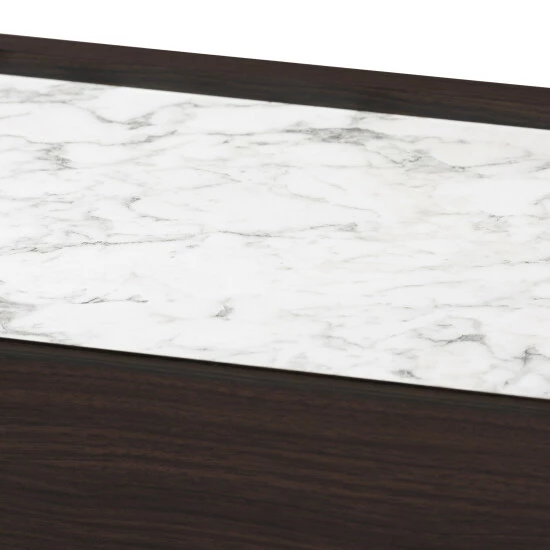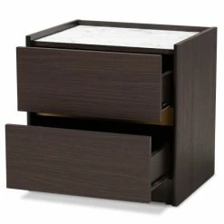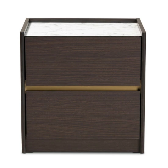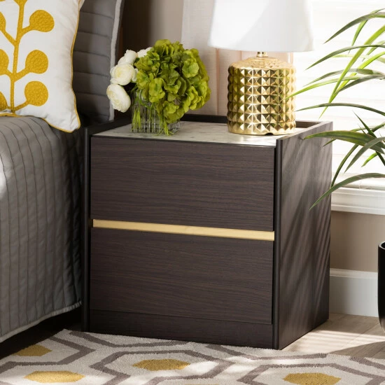 The sleek, modern flair of the Walker nightstand organizes your space in stunning style. Made in Malaysia, the Walker radiates rich wood tones with its dark brown finished frame. Two spacious drawers accommodate your lifestyle with plenty of space for bedside essentials. Requiring assembly, the Walker features a touch of gold, as well as a faux marble top, for luxurious accents steeped in modern glamour. With its radiant design and flexible convenience, the Walker nightstand is a superb addition to any space…