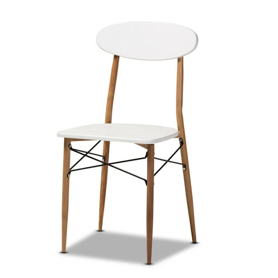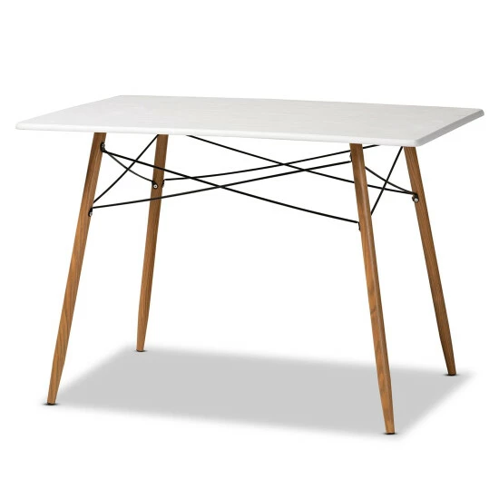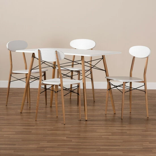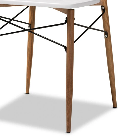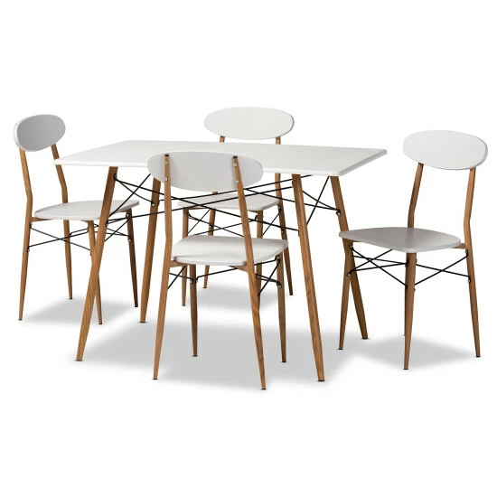 Add retro charm to your dining space with the Wayne dining set. Made in China, this set includes four dining chairs and one dining table. Constructed from metal overlaid with a walnut wood grain effect finish, the tabletop and seats feature a contrasting white wood grain effect finish that lends a cool, contemporary look. Black crisscross support bars add even more visual interest. Requiring assembly, each piece features angled legs for a mid-century inspired aesthetic. The compact, minimalist design of the Wayne conveys a light, open feel and allows it to easily fit within smaller dining spaces. Simple yet stylish, the Wayne dining set is an excellent addition to any home.