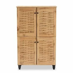 Keep your shoes organized and out of sight with the Winda shoe cabinet. Made in Malaysia, this cabinet is crafted from sturdy wood featuring a natural oak brown finish that easily coordinates with a wide range of interior designs. Four doors conceal six shelves with storage space for up to 18 pairs of shoes, depending on size. Requiring assembly, the Winda feature slits on the doors to enable air circulation and reduce odor buildup. A modern solution to entryway storage, the Winda shoe cabinet allows busy homes to feel more open and organized.. Ideal for smaller dining rooms and nooks, the Sanford dining nook set rejuvenates any space.