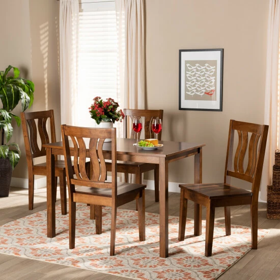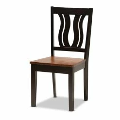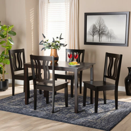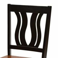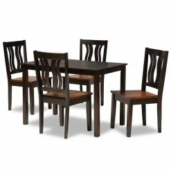 Featuring a unique, visually striking design, the Zamira dining set adds elegance to any dining space. Made in Malaysia, this wooden set includes four chairs and one table showcasing a distinctive two-tone dark brown and walnut brown finish. Each chair features a stunning geometric cut out design on its backrest for added visual appeal, while a scoop seat lends casual comfort. Requiring assembly, the rectangular tabletop provides ample elbow room for each member of the table. Emanating graceful charm, the Zamira dining set is an exceptional addition to the modern home…