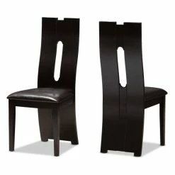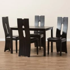 With details not to be missed, the Alani modern and contemporary dark brown faux leather upholstered dining set excites and delights for a truly enjoyable dining experience. This 5-piece dining set features an impressive extra-tall backrest with padded faux leather seats in dark brown. The chair features eye-catching cut-out shape on its bent backrest as an added contemporary style.