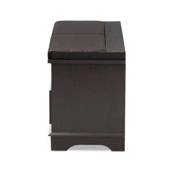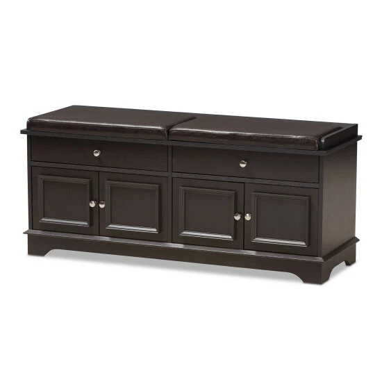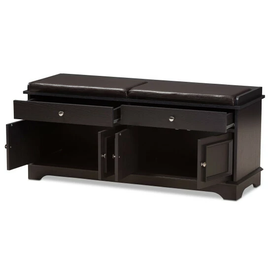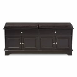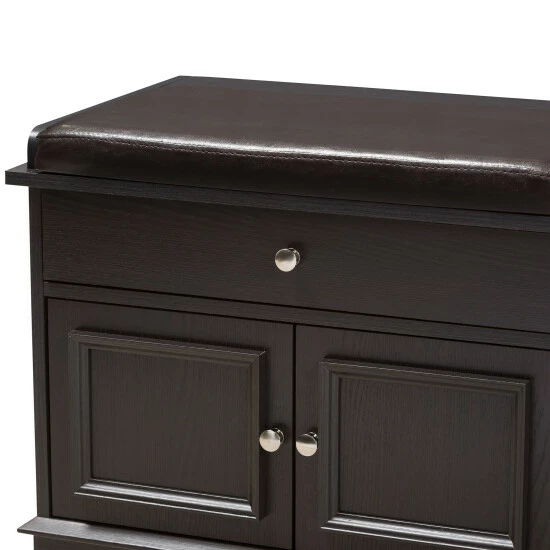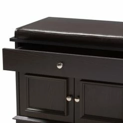 Give your home a cozy and inviting atmosphere with this upholstered shoe storage cabinet bench. Constructed of engineered wood in a dark brown finish, the storage bench will be an eye-catching piece, providing casual elegance that’s great for just about any home decor style. The cabinets with doors reveal ample shelving spaces while the pull-out drawers provide additional storage capacity.