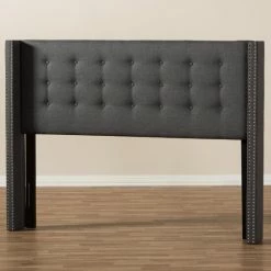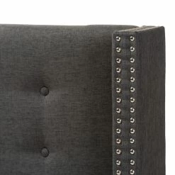 Exhibit luxury looks in your bedroom with the focal point of the lovely Ginaro fabric upholstered winged headboard. Constructed of solid rubberwood and plywood for strength and sturdiness, the Ginaro features button-tufted design in diamond shape and winged headboard with silver nail heads trims for luxury look in your bedroom. For extra comfort and an up-to-date look, the Gina is upholstered with dark grey or breyish beige polyester fabric over the padded foam for softness and shape that’s comfortable to lean against.