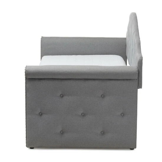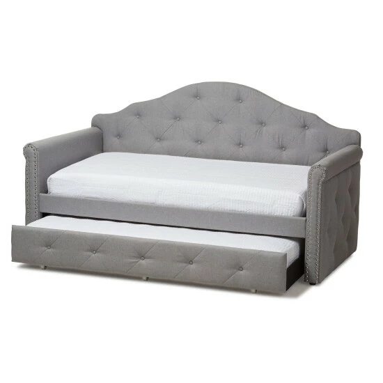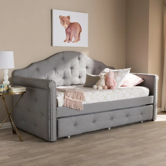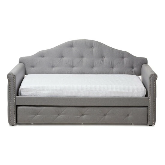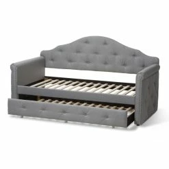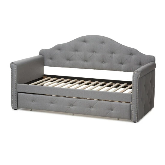 Elevate your guest room or teen’s room with this sophisticated daybed. Rolled arms give this bed daytime functionality as a sofa or lounge, while the grey fabric upholstery combines with button tufting and nailhead trim for a refined yet luxurious vibe. A roll-out trundlebed creates extra space for out-of-town guests or impromptu sleepovers.