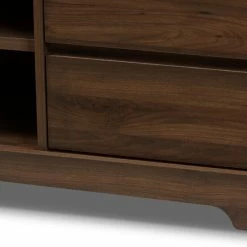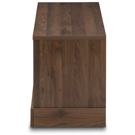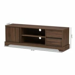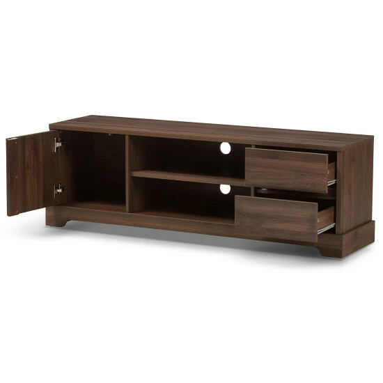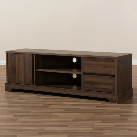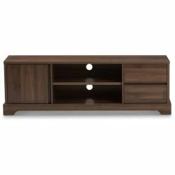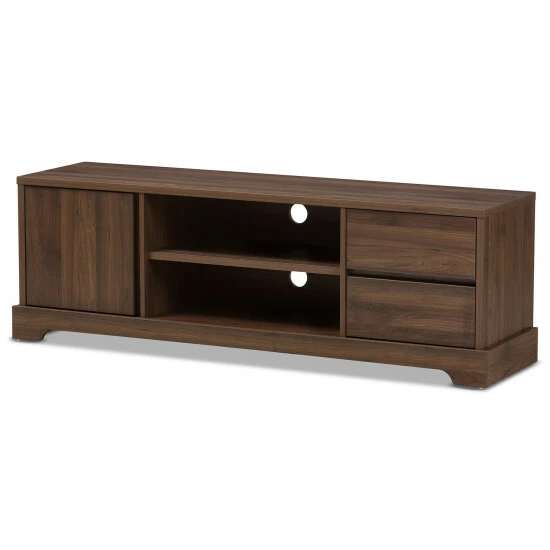Tie together the contemporary style of your family room with this TV stand by Baxton Studio. The walnut-brown finish highlights the clean lines on the rectangular wooden frame to renew the sophisticated look of your space, while two open slots offer space for a cable box or Blu-ray player. Two drawers and one cabinet provide ample storage for media essentials.