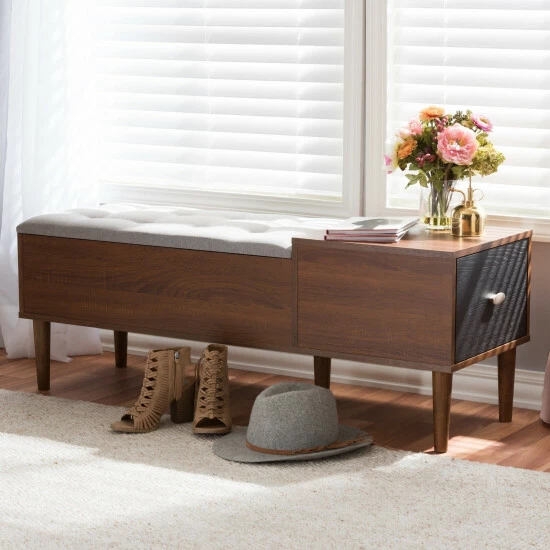 Dual-purposed and versatile, this bench is a great addition to your foyer, mudroom, utility room or bedroom. Featuring retro modern style, the Merrick is constructed of engineered wood and finished in two-tone finishing, oak and espresso brown. The upholstered cushion provides a comfortable seating area and ample storage space when it is lifted open.