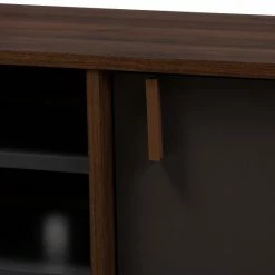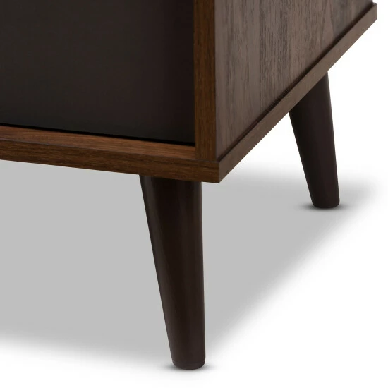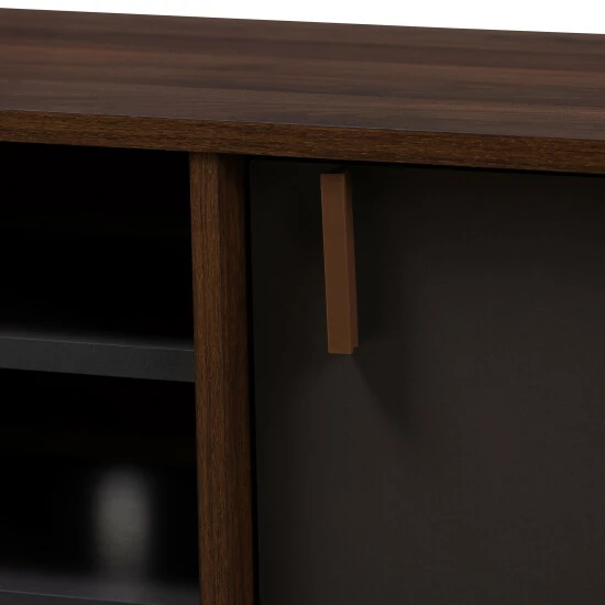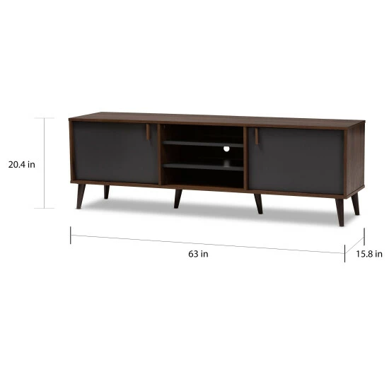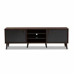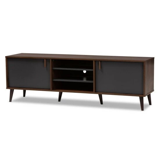 Store your media, peripherals, and entertainment essentials in this Samuel TV stand from Baxton Studio. The mid-century design brings a retro vibe into your room, and the combination of open and concealed storage let you tuck remotes, cords and wires out of sight. The ample rear cutout manages multiple cords for streamlined organization.