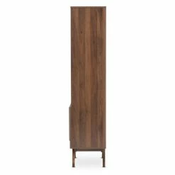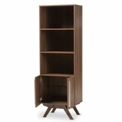 Bring a little mid-century whimsy to your living room with this classic brown bookcase and cupboard. Crafted from MDF and wood with a walnut finish, this classic shelf unit features three wide shelves just right for displaying favorite books and decor and a lower cabinet for hiding clutter and magazines. Angular legs create a fun, retro appearance.