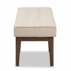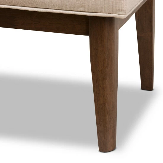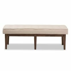 Perfect as a large seat in the dining room or in the entryway as an occasional piece, the Lucca mid-century modern button-tufted bench features clean lines on the dark walnut finishing wood frame and polyester upholstery for contemporary style influenced by vintage notes. Constructed of strong and solid rubberwood wood frame for a sturdy structure with lasting good looks, the seat is upholstered in polyester fabric for a soft feel with resilient quality. Button-tufted detailing instils a mid-century modern-inspired palette in your space.