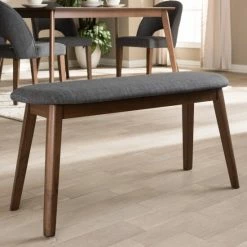 Expand your seating space with this bench by Baxton Studio. The clean lines and rich walnut-finished rubberwood legs project a nostalgic mid-century modern vibe, while the polyester upholstered and foam-padded seat ensures comfortable and relaxed sitting. The neutral fabric color blends with most settings for flexible decorating.