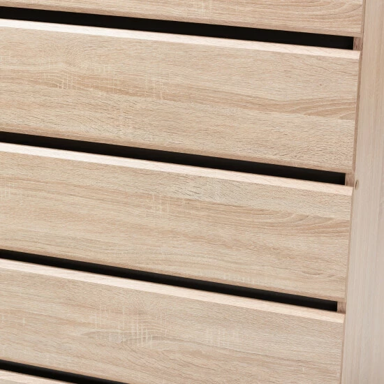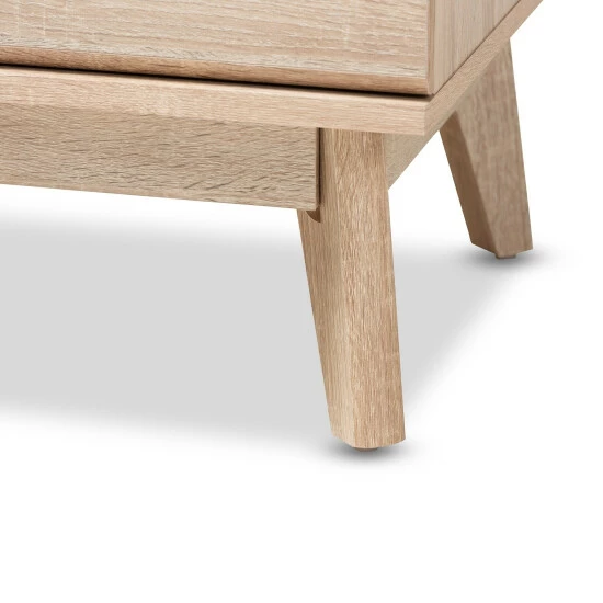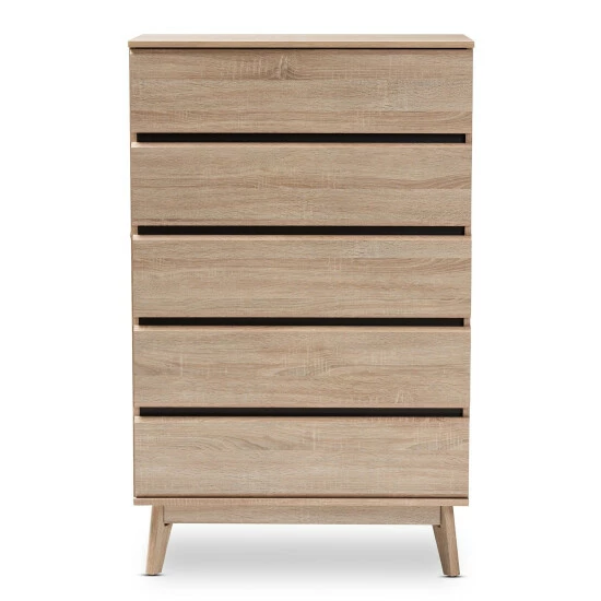 The simplicity and minimalist look of the Miren 5-drawer chest make it a seamless addition to your bedroom or guest room. The sleek silhouette and angled, tapered legs of the chest are hallmarks of its mid-century modern-inspired design. The Miren features an engineered wood frame finished in a light oak brown, with dark grey finishing between the drawers for a subtly contrasting color scheme.