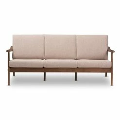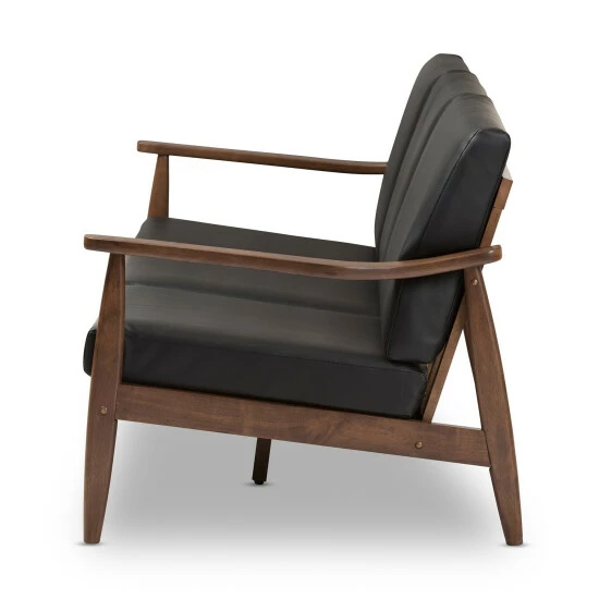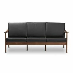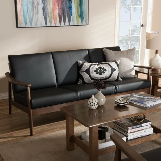 Look forward to unwinding after a long day, with the casual and relaxing design of the Venza 3-seater sofa. Constructed of solid rubberwood frame for strength and long-lasting durability, this mid-century modern-inspired sofa is built with clean paneled lines on the back, bringing relaxing vibes into your living room and complementing your home with lavish style. Cushions are upholstered in a soft but resilient black faux leather or light brown polyester fabric for plush comfort and lasting good looks.