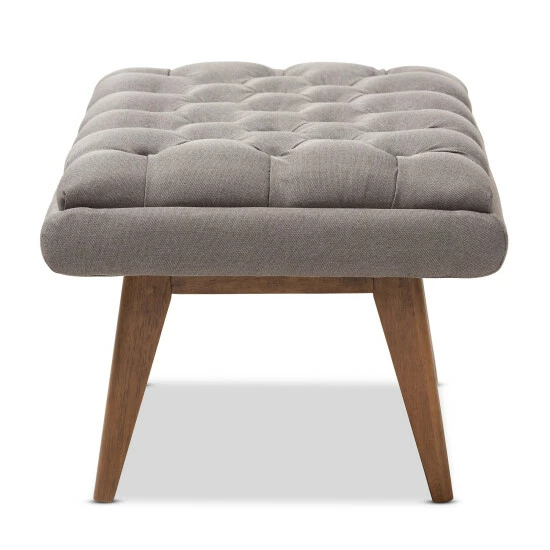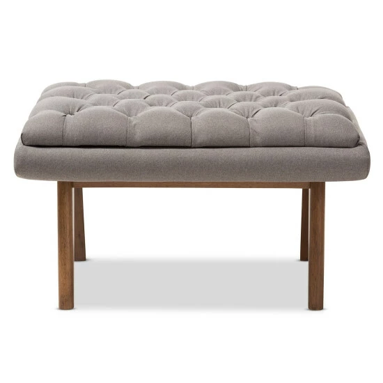 Use this upholstered ottoman as a cozy footstool or as an extra seat. Firmly bolstered by a solid rubberwood frame and legs, this ottoman has foam padding for comfort. This Annetha ottoman has a gorgeous mid-century style that gives your living room a modern and contemporary feel.