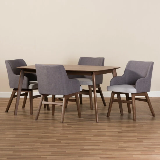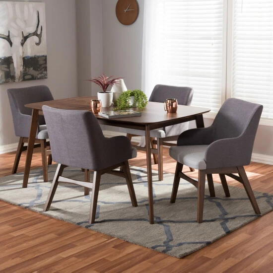 Showcase elegant contemporary design in your dining room with the comfortable Monte 5-piece dining set, consisting of a rectangular dining table with four dining armchairs in the set. Constructed of solid rubberwood frame, the Monte dining set offers a strong and sturdy structure for your dining room. Upholstered in two-tone dark grey and light grey polyester fabric, the dining armchairs provides exceptional softness and durability for long hours seating purposes.