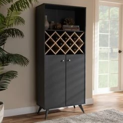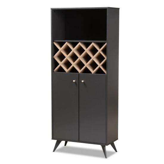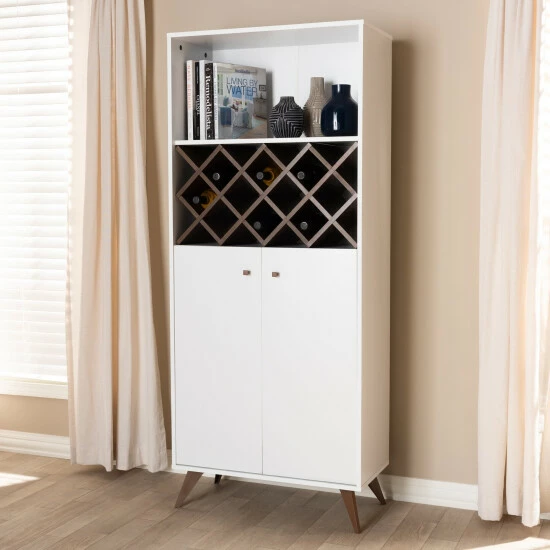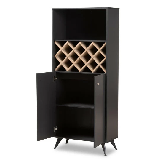 Unleash mid-century modern style in your wine storage with the Serafino wine cabinet. Constructed of engineered wood for durability, the Serafino features wine rack storage for up to ten bottles of wine. Two concealed shelves provide additional storage for decanters, bottle openers, and more.