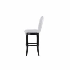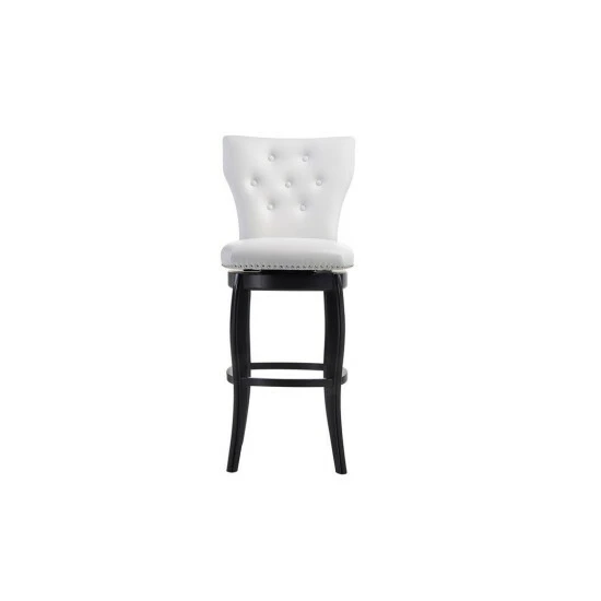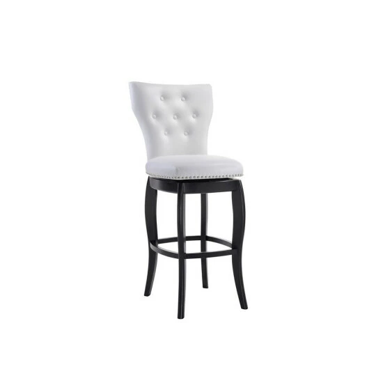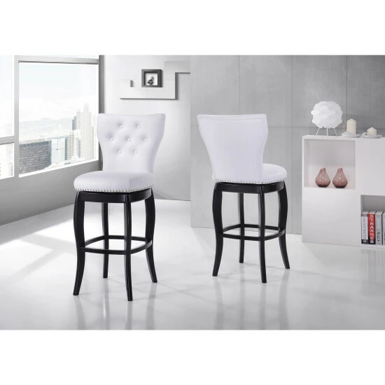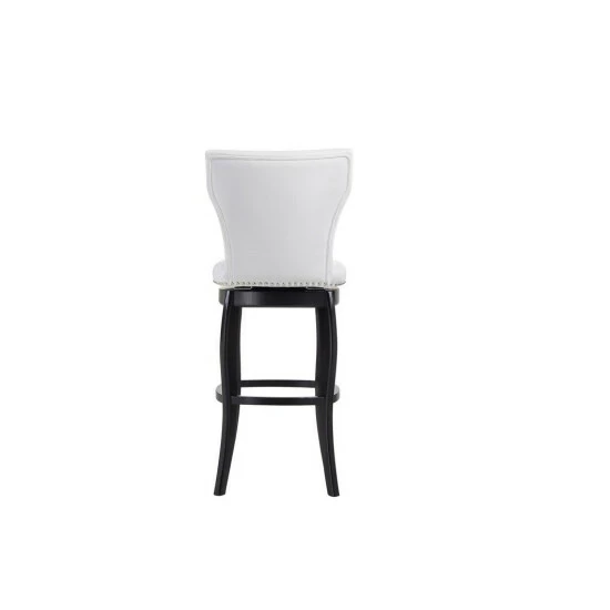 Atop swivel base with flared legs, the Leonice swivel barstool is both bold and classic. The silver nailheads trim around the seat complements the cut-out backrest in chic style while button-tufting design pull glamour up to your bar counter. Constructed of solid rubberwood legs, the Leonice swivel barstool is finished in dark espresso for a contemporary look. To add more comforts, the seat is fully padded and upholstered in white faux leather. For sturdiness, wood stretchers are added to serve as footrest and support. Featuring modern and contemporary in style, the graceful lines of the Leonice and the sleek design make this barstool a timeless piece for your bar and dining area. Made in Malaysia, the Leonice requires assembly.