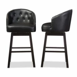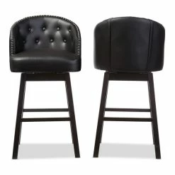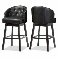 Sit for hours of entertaining conversation with friends or family on this set of two bar chairs, featuring nailhead trim for added charm. A metal plate mechanism allows you to swivel positions while perching comfortably on the faux-leather, button-tufted, foam-padded seats and strategically placed footrests.